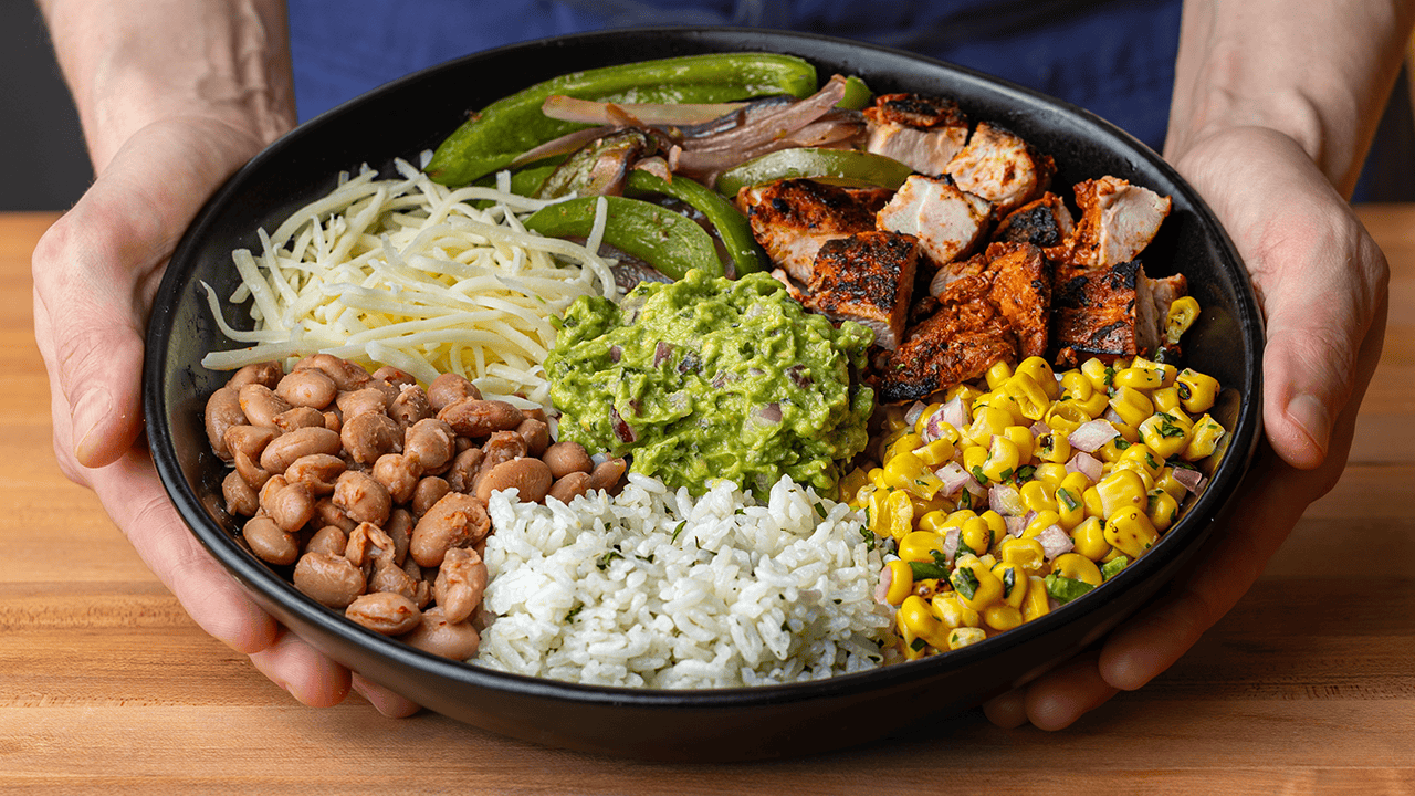 Step 10: Assemble the Bowl. Layer cilantro-lime rice on the bottom, then add fajita veggies, pinto beans, corn salsa, chicken, shredded cheese, and guacamole. If you want the authentic restaurant experience, scowl at anyone who asks for extra.