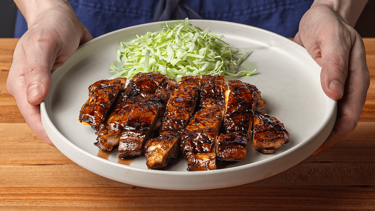 Rest, slice, and serve. Move the chicken to a cutting board and rest it for 5 minutes. Slice each thigh on the bias into half-inch pieces. Spoon any remaining tare from the pan over the sliced chicken.